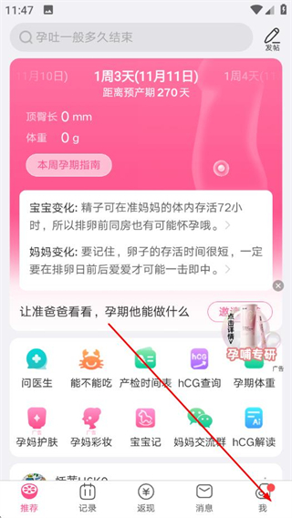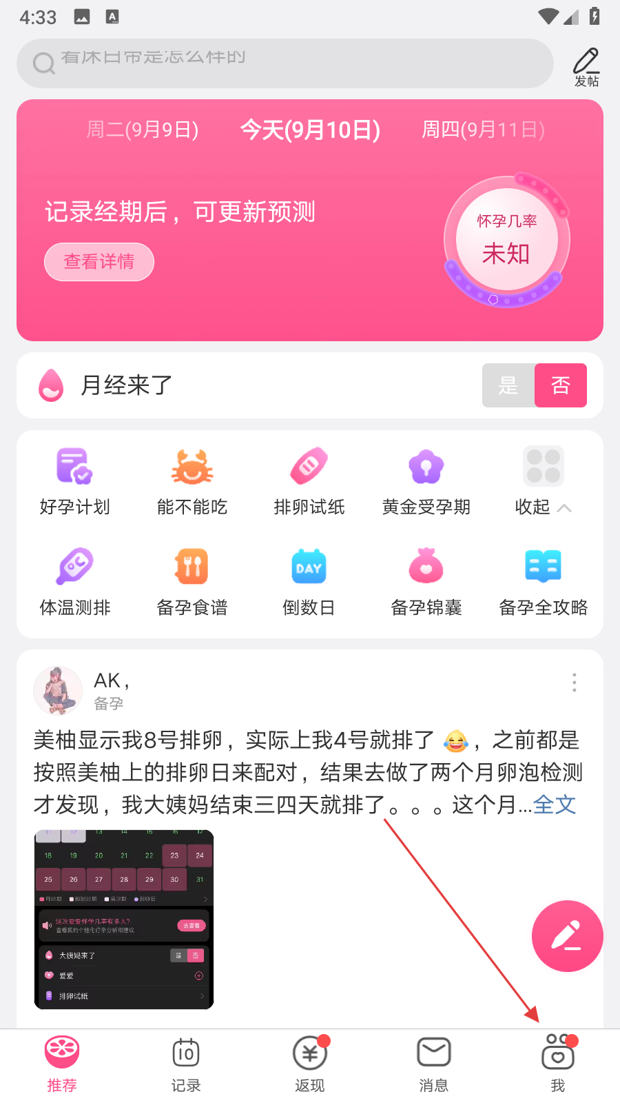 1、在美柚首頁點(diǎn)擊底部的記錄選項(xiàng),進(jìn)入記錄頁面。