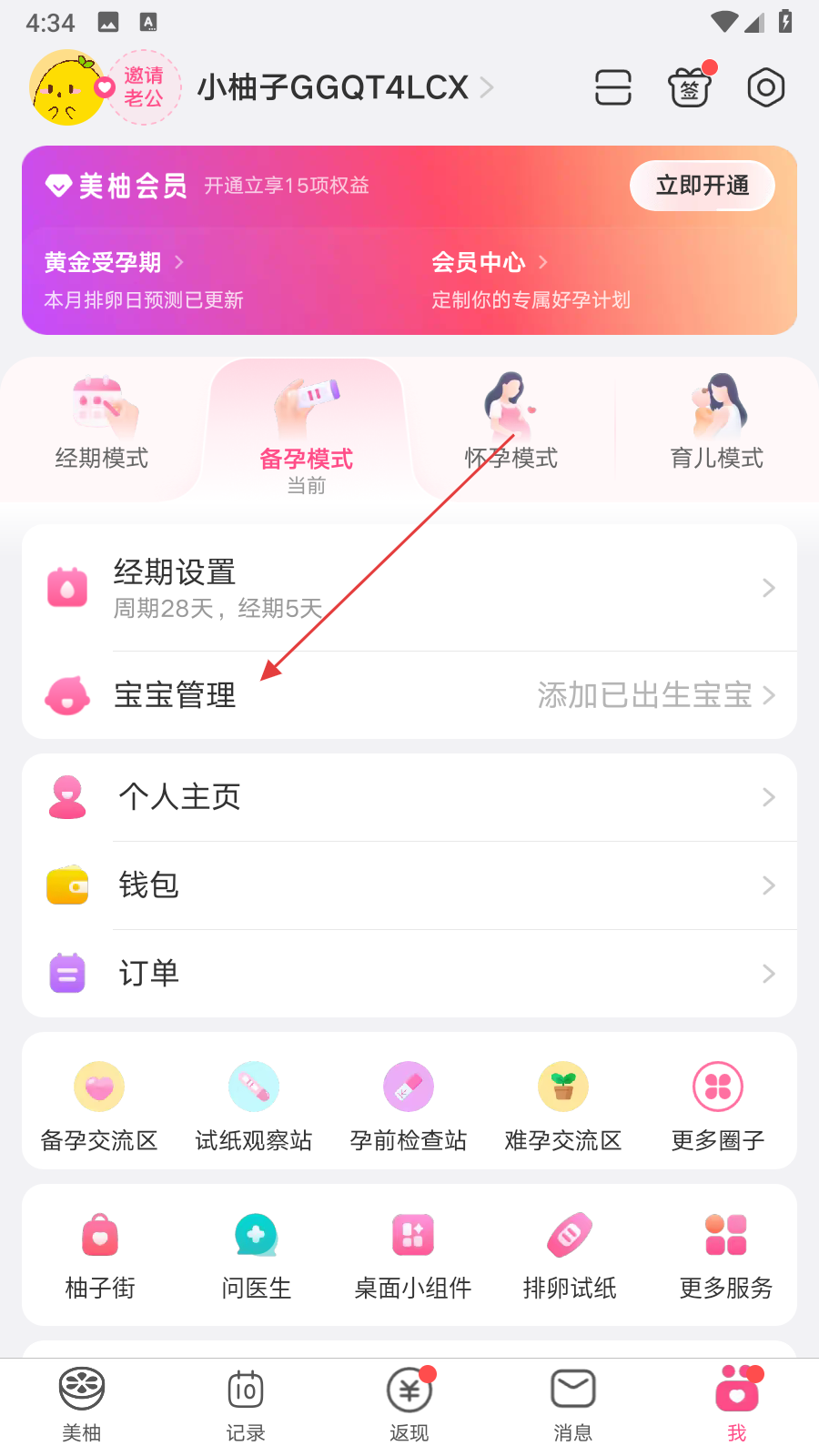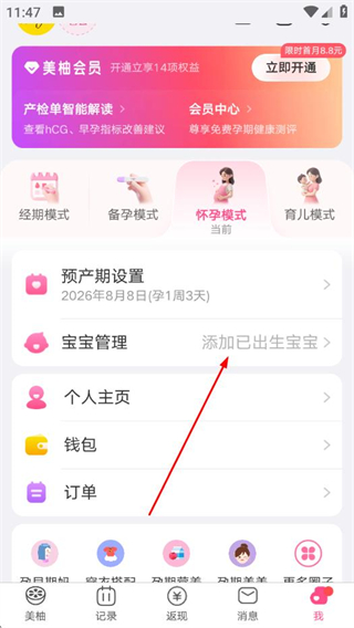 2、在個人頁面中,點(diǎn)擊寶寶管理選項(xiàng),進(jìn)入寶寶管理界面。