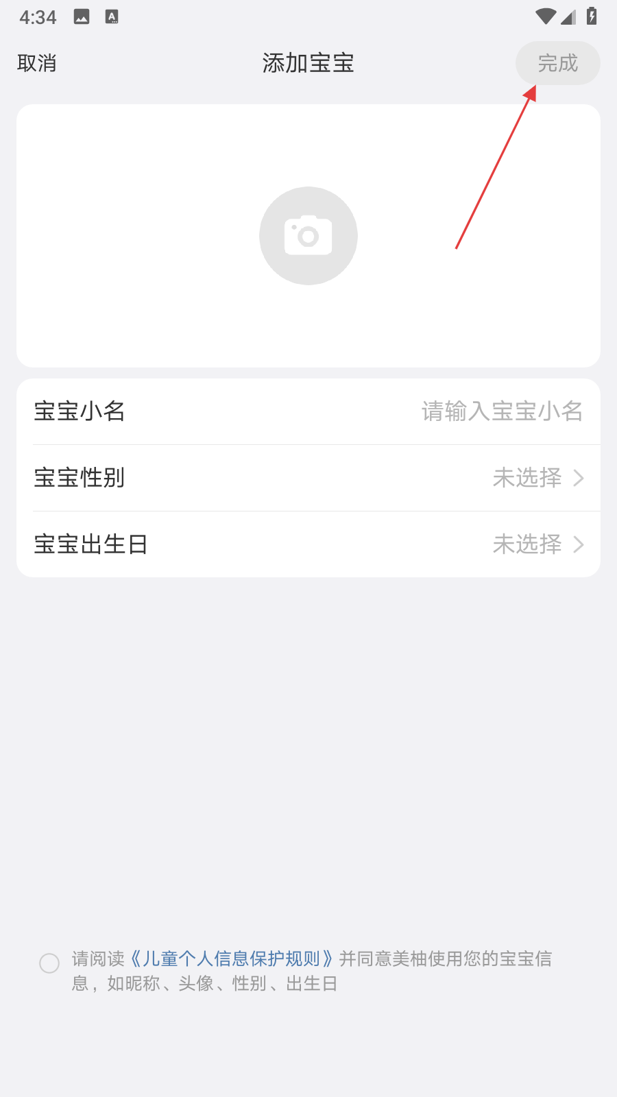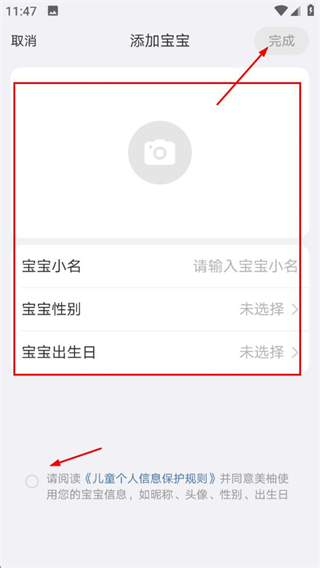 4、填寫小名、選擇性別和出生日,勾選后,點(diǎn)擊完成。