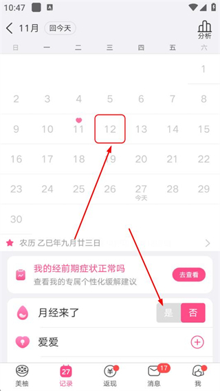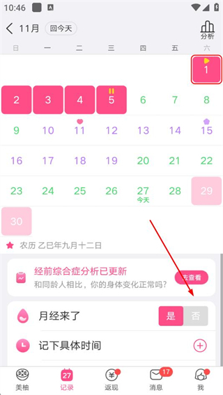 2、在記錄頁面中,點(diǎn)擊月經(jīng)來了右側(cè)的否,修改之前錯誤的時(shí)間。