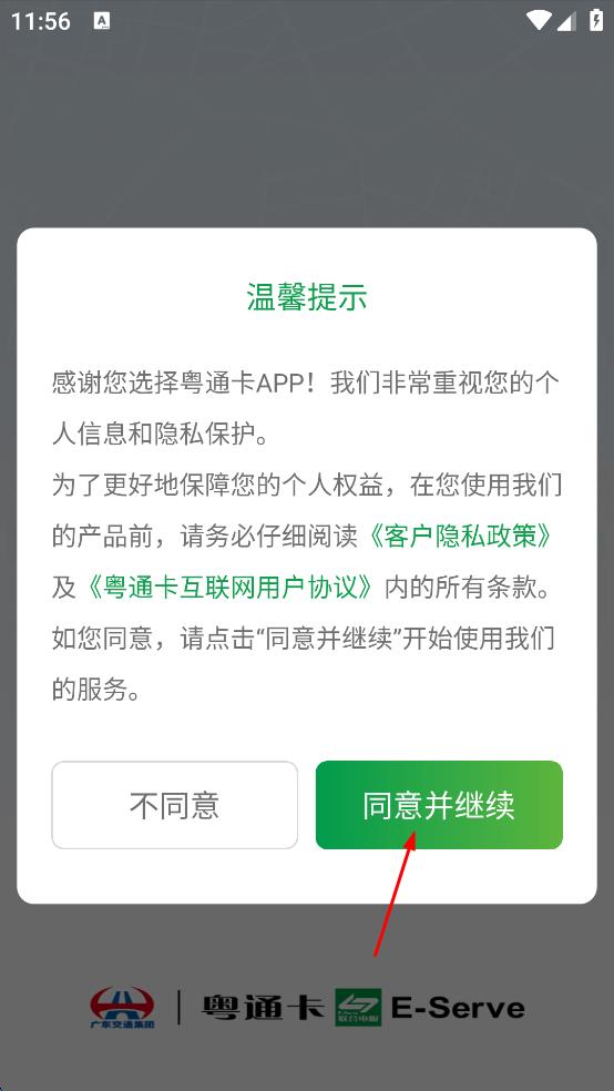 1、打開粵通卡APP,會彈出溫馨提示頁面,仔細(xì)閱讀后點擊同意并繼續(xù)按鈕。