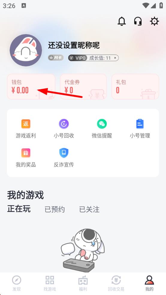 1、打開66手游應用,點擊底部導航欄中的我的,進入個人界面,點擊錢包選項。