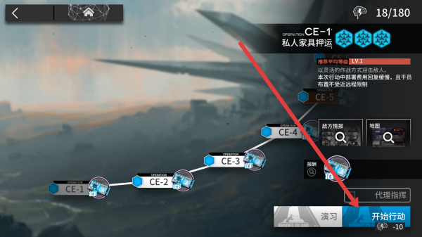 2、進入到貨幣資源關卡中,可以選擇第一關點擊開始行動按鈕,消耗10點理智行動。