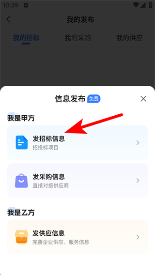 4、在選項中選擇發(fā)招標信息,即可按照提示完成招標信息發(fā)布。