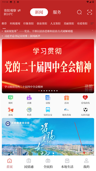 1、打開(kāi)資陽(yáng)觀察app,進(jìn)入時(shí)點(diǎn)擊底部我的圖標(biāo)。
