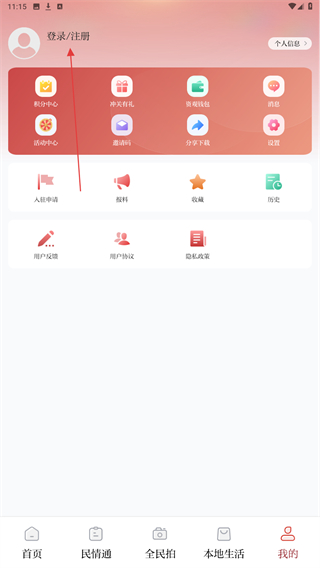 2、進(jìn)入我的頁(yè)面內(nèi),點(diǎn)擊上方登錄/注冊(cè)的按鈕。