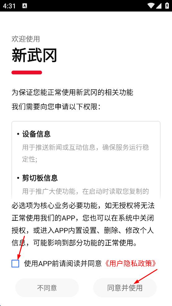 1、打開(kāi)新武岡APP,彈出權(quán)限申請(qǐng)及用戶隱私政策提示框,勾選使用APP前請(qǐng)閱讀并同意用戶隱私政策,點(diǎn)擊“同意并使用”按鈕,進(jìn)入APP體驗(yàn)界面。