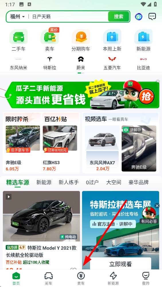 1、打開瓜子二手車app進入首頁后,點擊底部導(dǎo)航欄中的賣車選項,進入賣車相關(guān)界面。