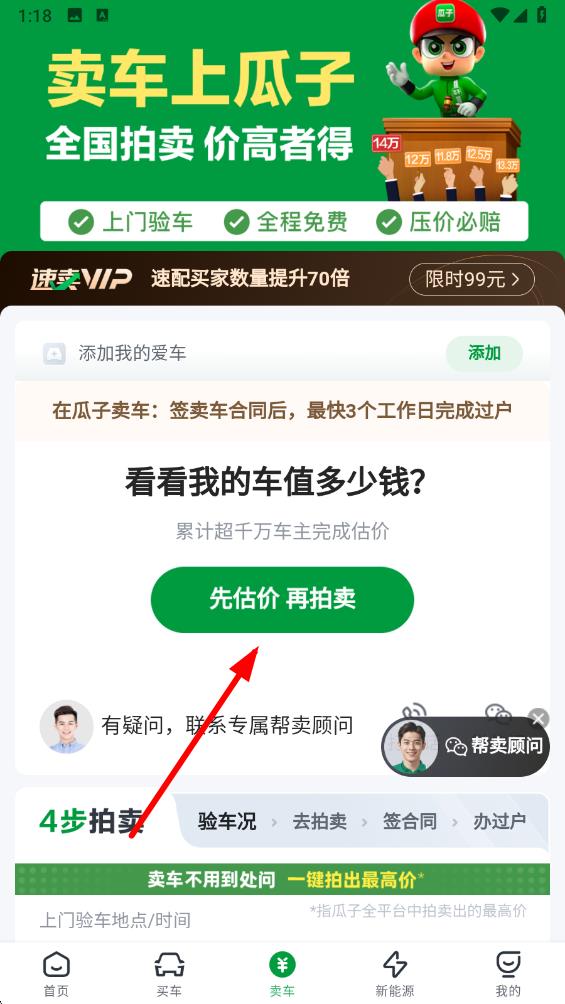 2、在賣車界面中,點擊先估價再拍賣按鈕,對您要出售的車輛進行估價。