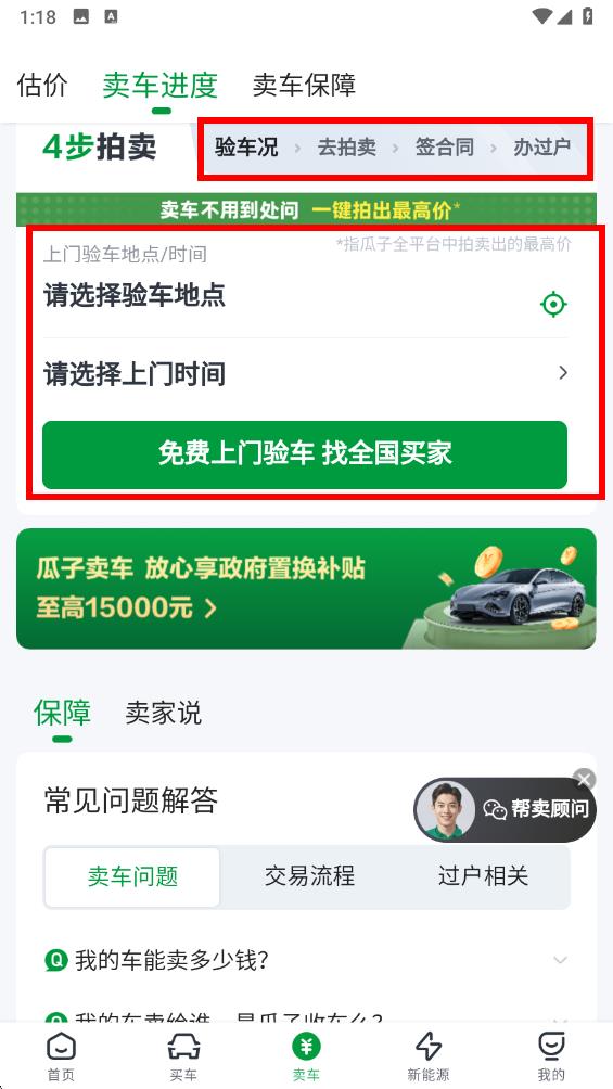 3、估價完成后,按照頁面提示,選擇驗車況,填寫上門驗車地點和時間,預(yù)約免費上門驗車服務(wù),之后依次完成去拍賣、簽合同、辦過戶等后續(xù)流程,完成賣車操作。