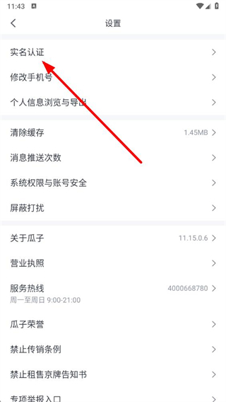 3、在設(shè)置界面中,找到實名認證選項并點擊,進入實名認證頁面。
