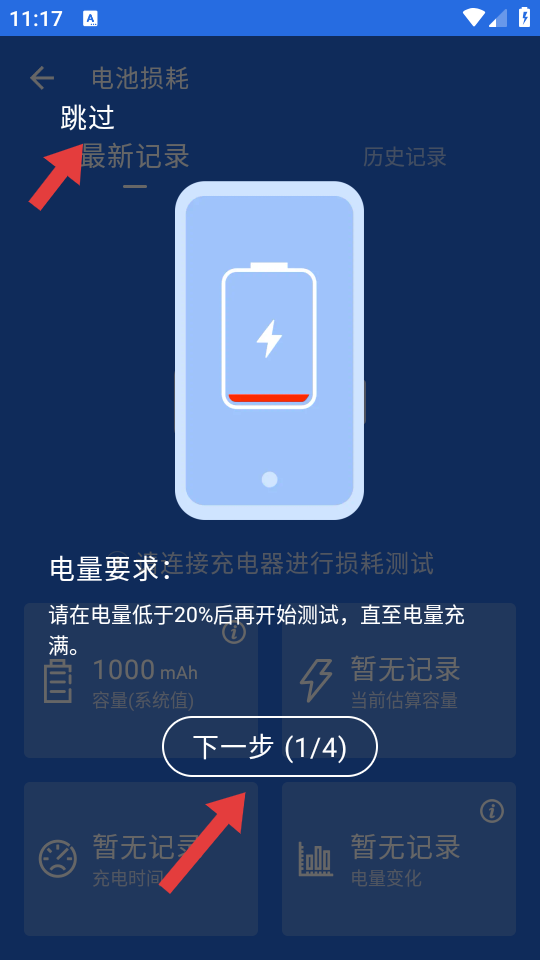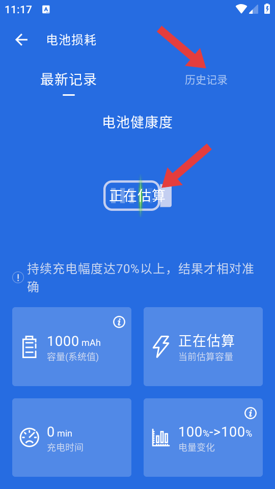 4、在歷史記錄的頁(yè)面,若顯示暫無(wú)記錄,需完成一次充電后重新進(jìn)行電池?fù)p耗測(cè)試。