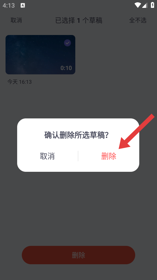 4、在彈出的確認刪除所選草稿提示框中,點擊刪除按鈕,完成作品刪除操作。