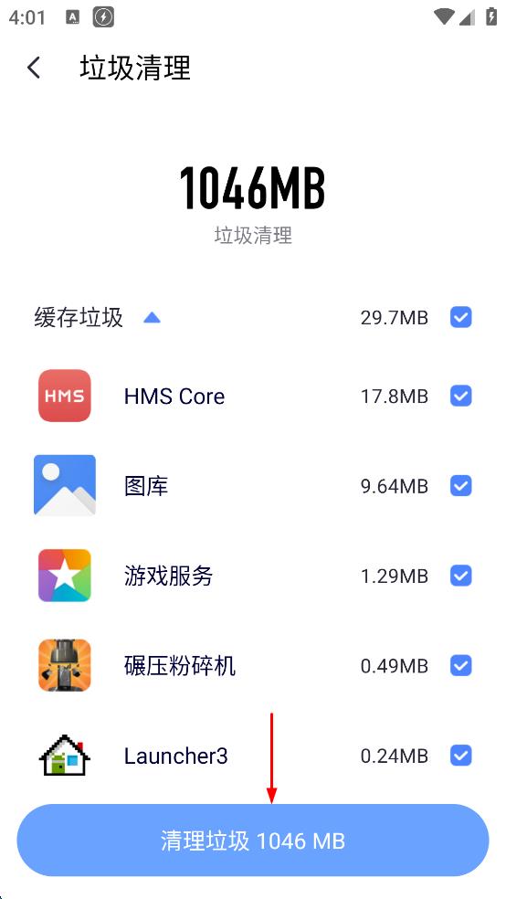 2、在APP主界面,點擊“一鍵清理”按鈕,進入垃圾清理詳情頁面。
