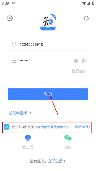 4、勾選我已閱讀并同意知到教師版使用協(xié)議隱私政策,點(diǎn)擊登錄按鈕。