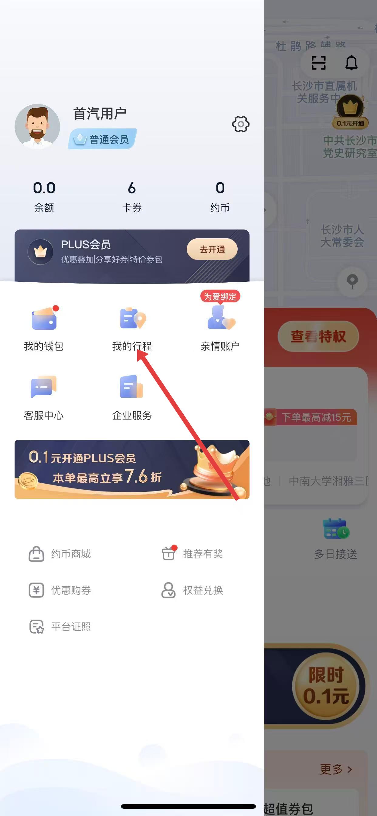 2、在個(gè)人中心頁(yè)面中,找到并點(diǎn)擊我的行程選項(xiàng)。
