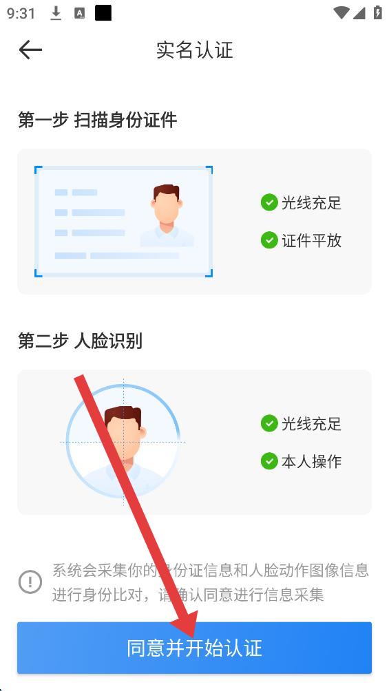 4、進(jìn)入實(shí)名認(rèn)證頁(yè)面,點(diǎn)擊同意開(kāi)始認(rèn)證,按照指引完成后續(xù)操作即可。