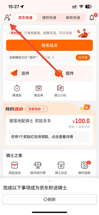 1、在京東秒送騎士app頁(yè)面點(diǎn)擊左上角菜單按鈕,展開(kāi)功能列表。