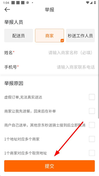 4、在舉報(bào)頁(yè)面選擇商家舉報(bào)人員類(lèi)型,填寫(xiě)詳細(xì)信息,選擇舉報(bào)原因后點(diǎn)擊提交按鈕。