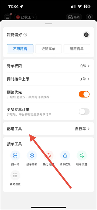 2、在接單設(shè)置頁(yè)面點(diǎn)擊配送工具選項(xiàng),進(jìn)入選擇交通工具頁(yè)面。