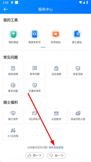 3、在服務(wù)中心頁(yè)面的底部,點(diǎn)擊聯(lián)系智能客服選項(xiàng),進(jìn)入客服對(duì)話(huà)界面。