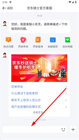 4、在京東騎士官方客服界面,可直接在輸入框中描述問(wèn)題,與智能客服進(jìn)行溝通咨詢(xún)。