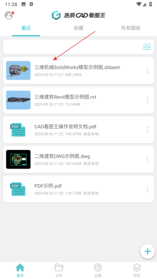 1、打開(kāi)浩辰CAD看圖王APP,點(diǎn)擊需要測(cè)量尺寸的圖紙文件,進(jìn)入圖紙查看界面。