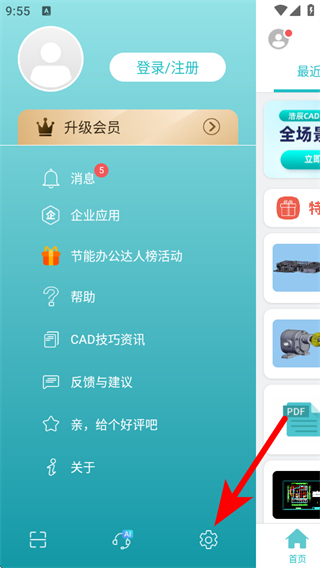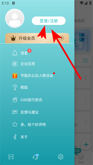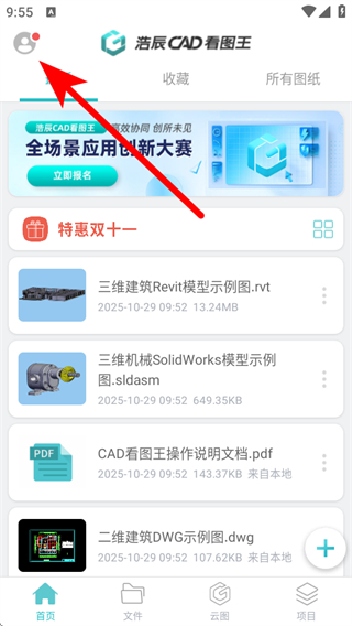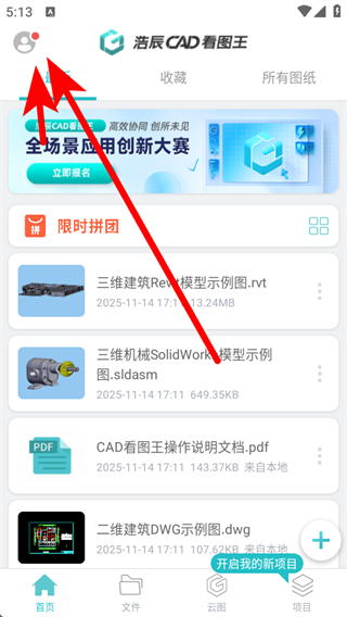 1、打開(kāi)浩辰CAD看圖王APP,點(diǎn)擊左上角的頭像,展開(kāi)個(gè)人功能菜單。