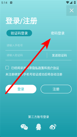 3、進(jìn)入登錄/注冊(cè)頁(yè)面后,需要點(diǎn)擊密碼登錄的選項(xiàng)。