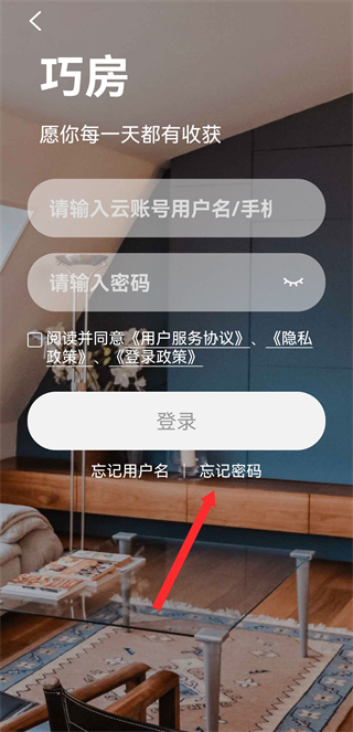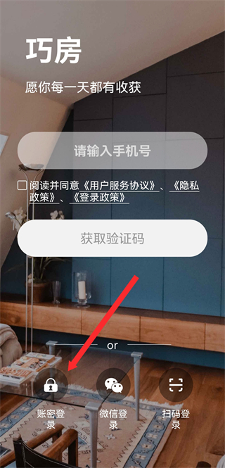 1、打開巧房APP,在登錄頁(yè)面點(diǎn)擊賬密登錄,進(jìn)入賬密登錄的頁(yè)面。