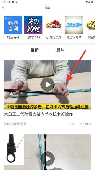 2、視頻頁(yè)頂部設(shè)釣魚百科、浮釣、小白闖江湖等垂直標(biāo)簽,點(diǎn)擊標(biāo)簽快速篩選對(duì)應(yīng)領(lǐng)域教程如釣技拆解選釣魚百科,野釣技巧、選浮釣標(biāo)簽。