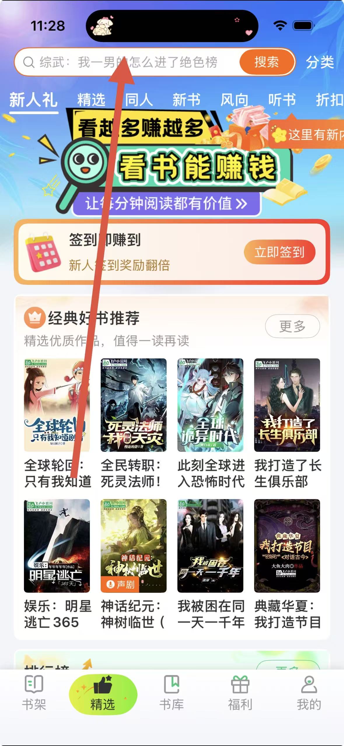 1、打開飛盧小說APP,在精選頁面點(diǎn)擊頂部搜索欄,輸入想查找的小說關(guān)鍵詞。
