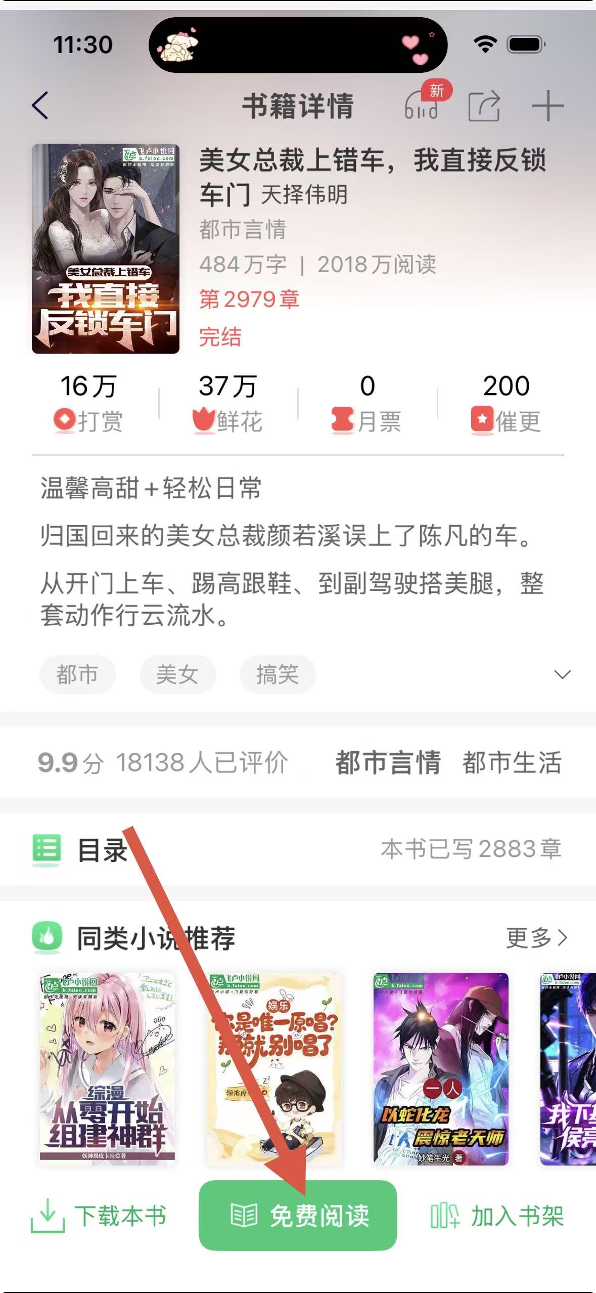 4、在書籍詳情頁,點(diǎn)擊免費(fèi)閱讀按鈕,即可開始閱讀該小說資源。