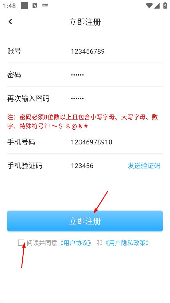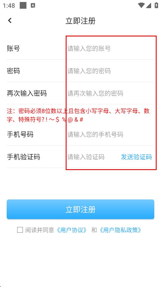 4、勾選閱讀并同意用戶協(xié)議和用戶隱私政策,點(diǎn)擊“立即注冊(cè)”,完成注冊(cè)后可返回登錄界面進(jìn)行登錄。