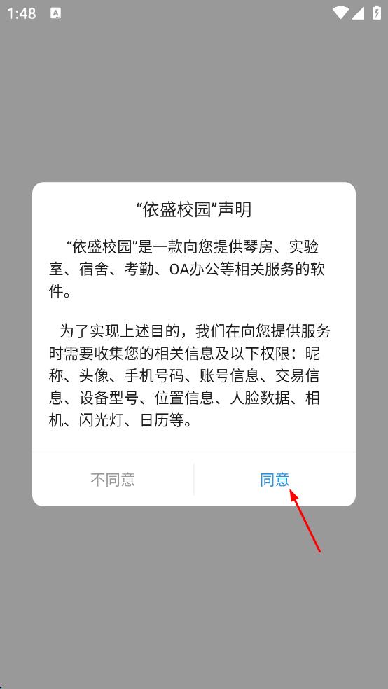 1、打開“依盛校園”APP,彈出“依盛校園”聲明,仔細(xì)閱讀后點(diǎn)擊“同意”,進(jìn)入登錄界面。