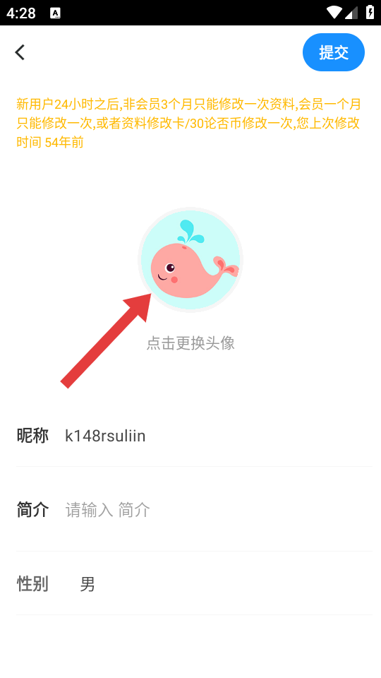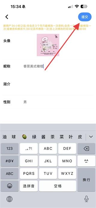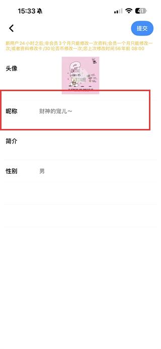 4、昵稱輸入完成后,點(diǎn)擊右上角提交,即可完成個人資料中昵稱的編輯操作。