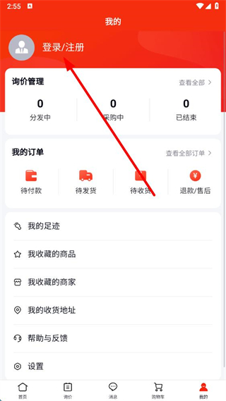 1、在百度愛(ài)采購(gòu)app我的界面,點(diǎn)擊登錄注冊(cè)。