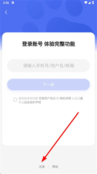 3、在登錄賬號(hào)界面點(diǎn)擊底部注冊(cè),進(jìn)入百度賬號(hào)注冊(cè)界面。