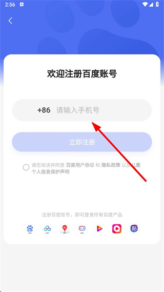 4、在百度賬號(hào)注冊(cè)界面輸入手機(jī)號(hào),勾選同意協(xié)議后點(diǎn)擊立即注冊(cè),完成百度賬號(hào)注冊(cè)。