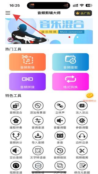1、打開(kāi)音頻剪輯大師APP,在首頁(yè)左上冊(cè),點(diǎn)擊三個(gè)橫線的圖標(biāo)。
