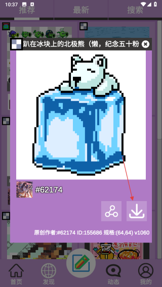 2、進(jìn)入所選像素畫的詳情界面后,點(diǎn)擊界面中的下載按鈕,將該像素畫素材保存到本地。