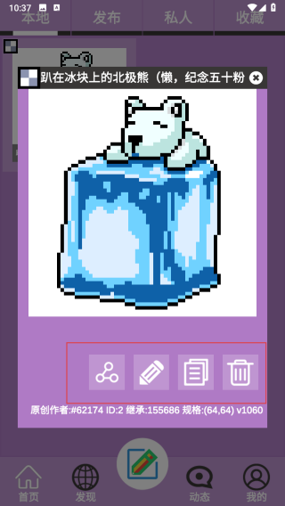 4、點(diǎn)擊素材后,會彈出包含分享、編輯、查看詳情、刪除等功能的操作欄,可根據(jù)需要對像素畫進(jìn)行后續(xù)操作。