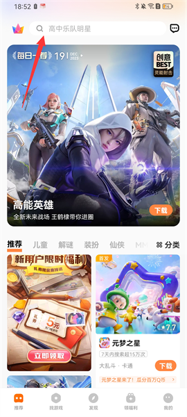 2、來到軟件首頁,有給大家提供超多的游戲資源,用戶也可以直接點擊上方的搜索欄,如下圖所示,輸入游戲名稱,快速搜索;