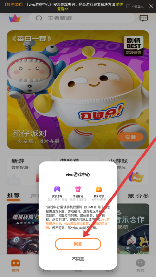 1、打開vivo游戲中心,彈出用戶協(xié)議及隱私政策提示彈窗,點擊橙色同意按鈕,進入應用開始瀏覽游戲。
