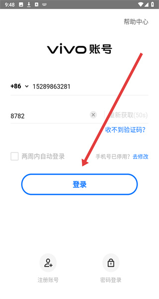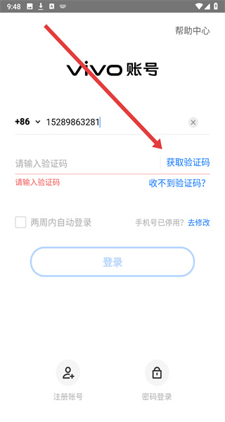 3、在跳轉到vivo賬號登錄頁面,輸入好手機號后點擊獲取驗證碼按鈕進行登錄。