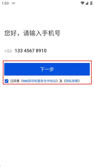 1、打開900游司機(jī)端應(yīng)用,在手機(jī)號(hào)輸入頁(yè)面填寫對(duì)應(yīng)的手機(jī)號(hào)碼。