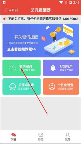 1、打開(kāi)藝凡提醒器APP,點(diǎn)擊群關(guān)鍵詞,進(jìn)入關(guān)鍵詞設(shè)置頁(yè)面。