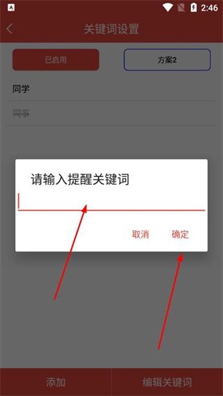 3、在關(guān)鍵詞輸入框中輸入提醒關(guān)鍵詞,點(diǎn)擊確定,即可完成關(guān)鍵詞添加。