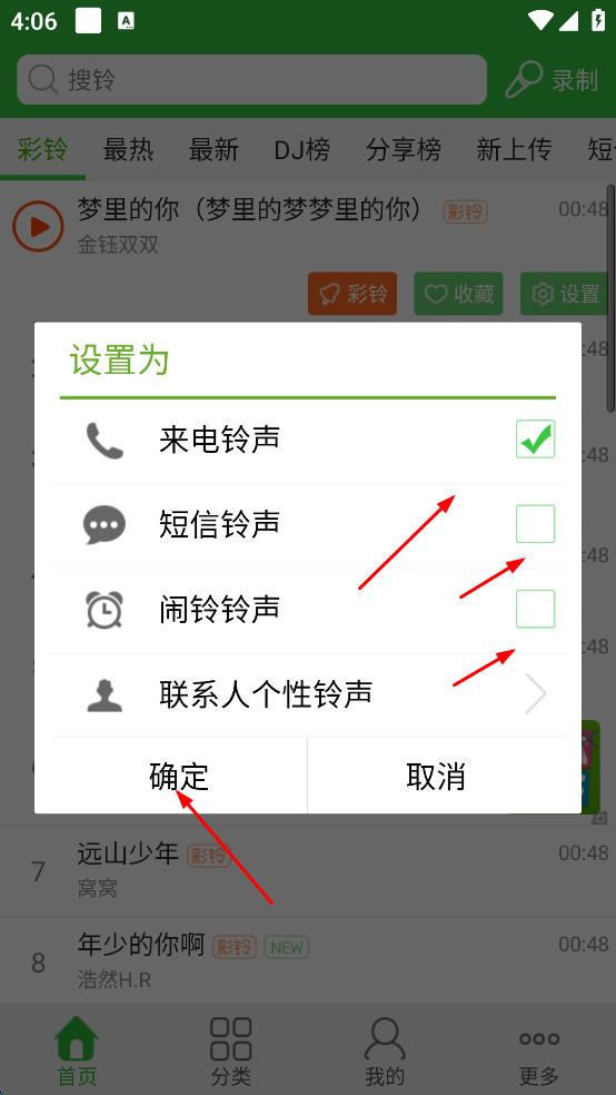 3、在設(shè)置為彈窗,選擇來電鈴聲、短信鈴聲等所需鈴聲類型,點(diǎn)擊確定,完成鈴聲設(shè)置操作 。