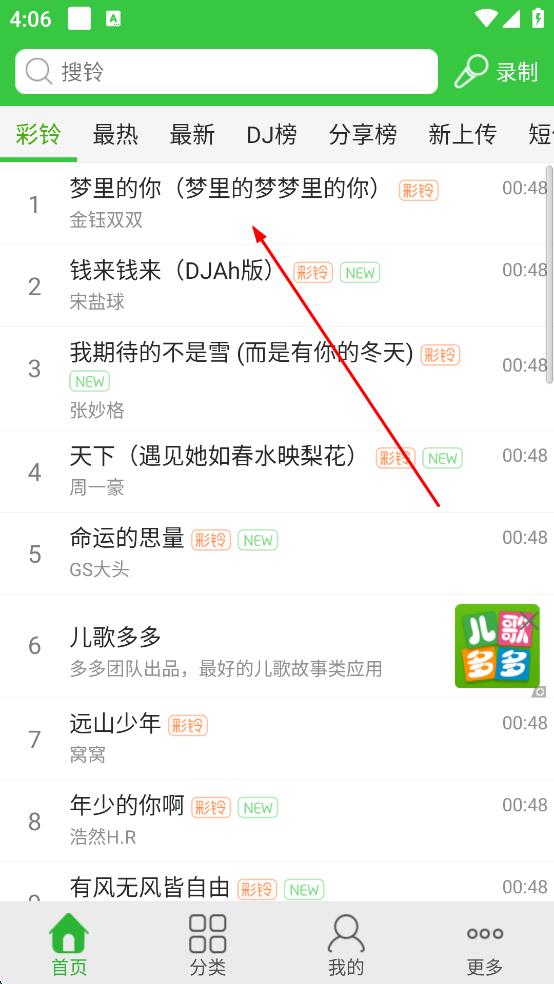 2、在首頁(yè)彩鈴列表,找到想設(shè)置的鈴聲如夢(mèng)里的你,點(diǎn)擊該鈴聲條目,進(jìn)入鈴聲操作界面。